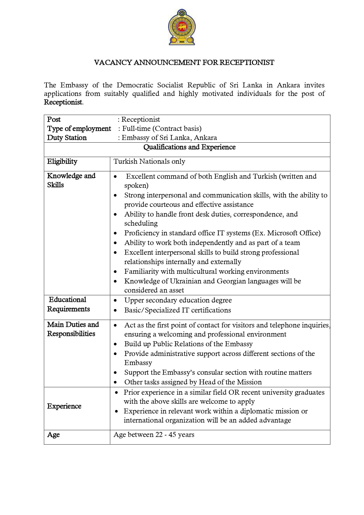 Post : Receptionist Type of employment : Full-time (Contract basis) Duty Station : Embassy of Sri Lanka, Ankara |