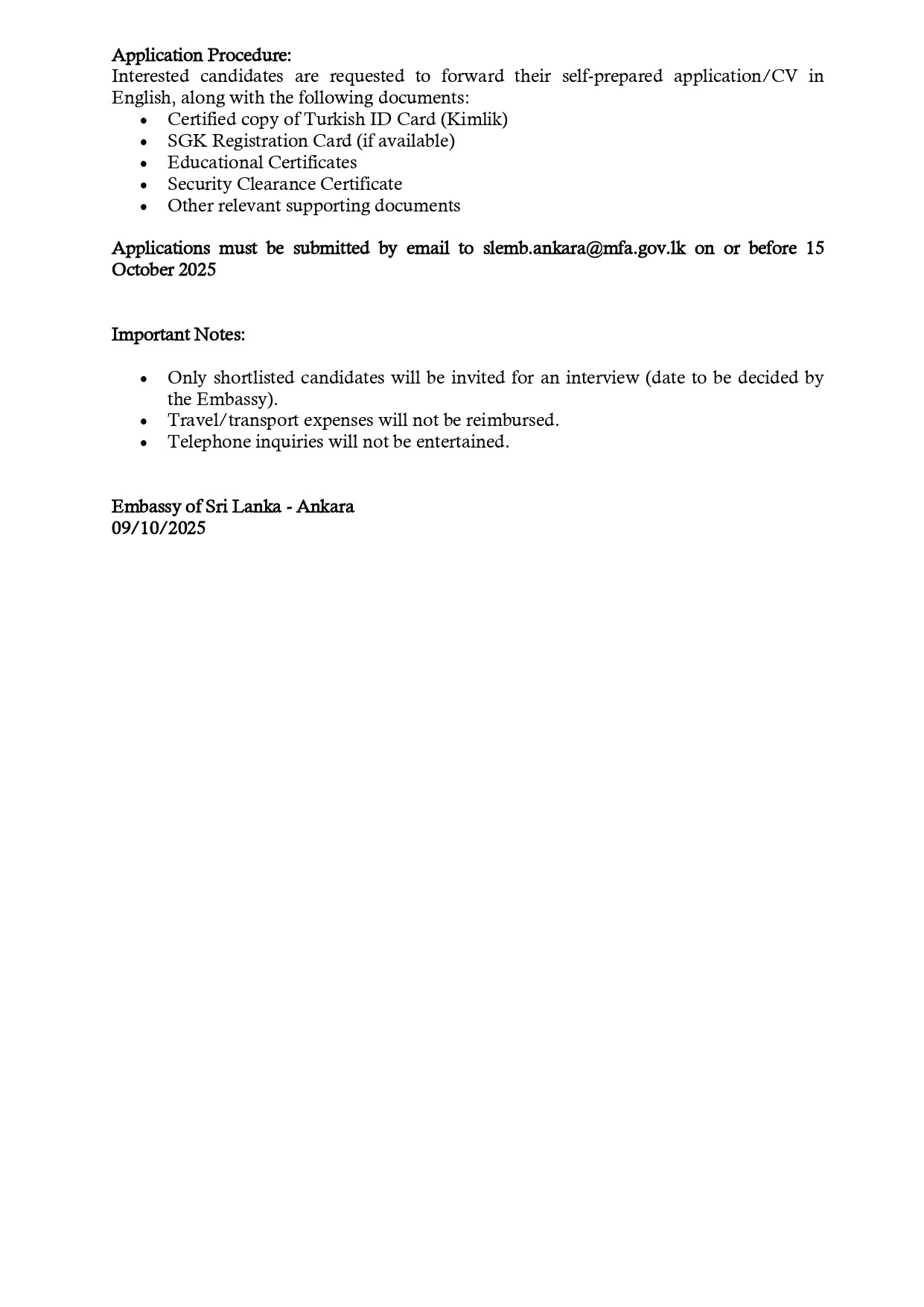 Applications must be submitted by email to slemb.ankara@mfa.gov.lk on or before 15 October 2025