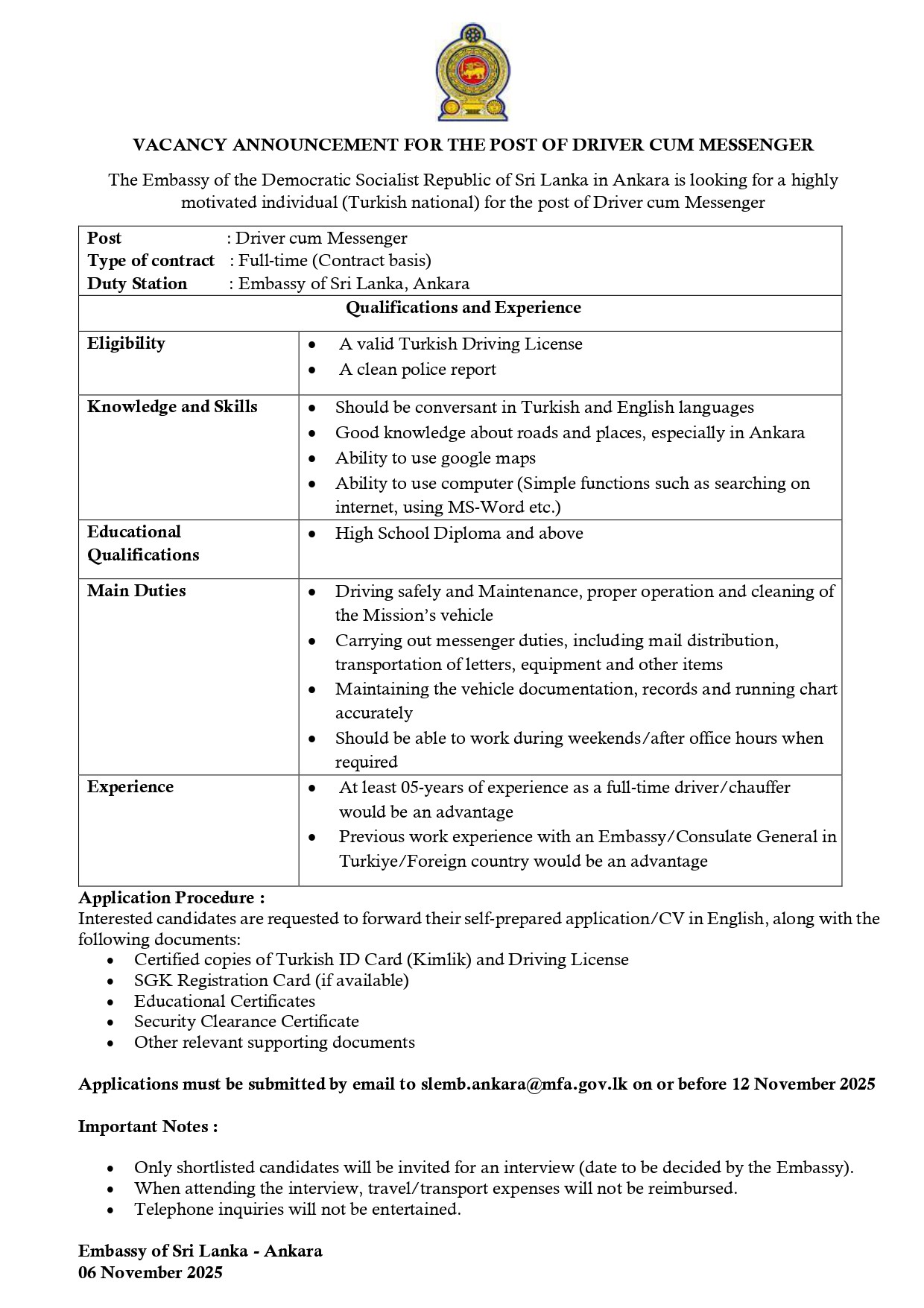 VACANCY ANNOUNCEMENT FOR THE POST OF DRIVER CUM MESSENGER